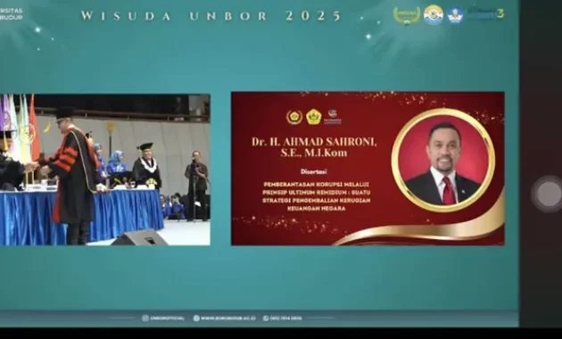 Sahroni tercatat sebagai salah satu wisudawan yang meraih gelar doktor dengan disertasi berjudul “Pemberantasan Korupsi Melalui Prinsip Ultimatum Remidium: Suatu Strategi Pengembalian Uang Negara.” Dalam video yang diunggah kanal YouTube Universitas Borobudur, Sahroni tampak percaya diri dan tersenyum saat naik ke panggung serta bersalaman dengan para petinggi kampus.